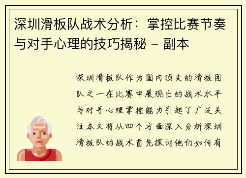 深圳滑板队战术分析:掌控比赛节奏与对手心理的技巧揭秘 - 副本