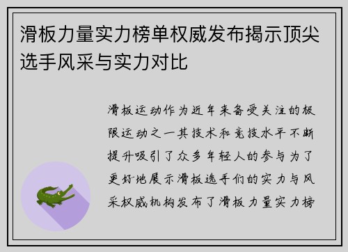 滑板力量实力榜单权威发布揭示顶尖选手风采与实力对比
